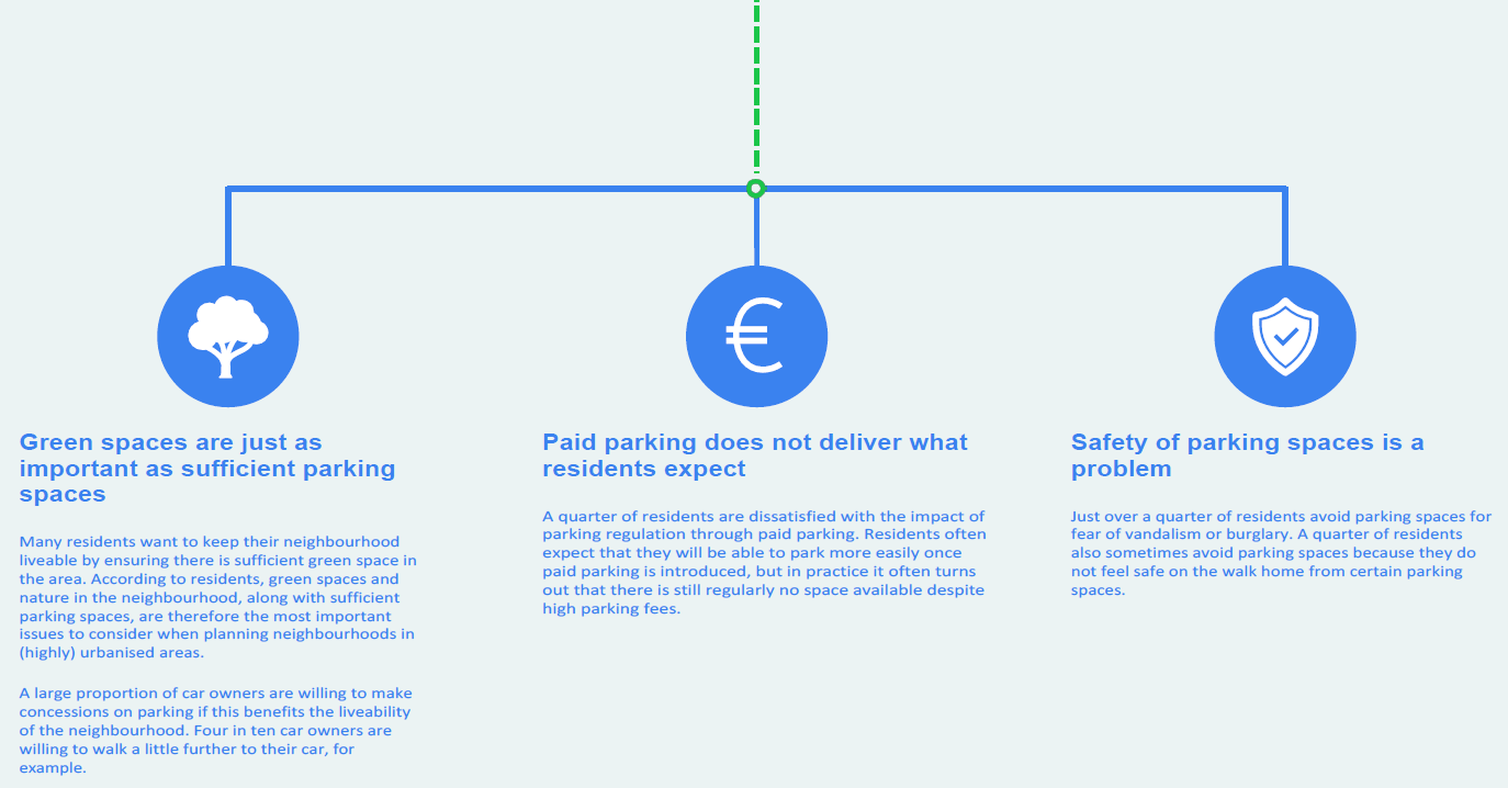 Residents of (highly) urbanised areas regularly experience difficulties finding a parking space in their neighbourhood. Only half indicate it is easy to find a parking space in their own neighbourhood, and a quarter even adjust their car use and daily routine to cope with the parking pressure.